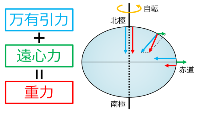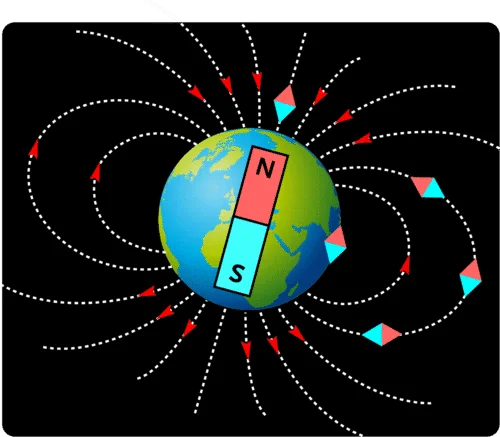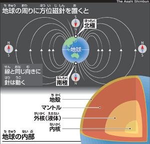 「北極が北」・「南極が南」なので「方位磁力」が北を指しますし、ここに「重力(9.8m/s)」で押しつけているので人間は立っていられるのです。