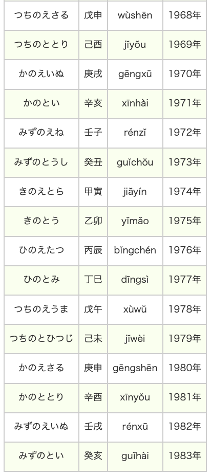 干支は全部で60種類あるため、干支による暦の表現は、「60年周期」となります。西暦の欄の年に60の倍数を足したり引いたりした年も同じ干支になります。