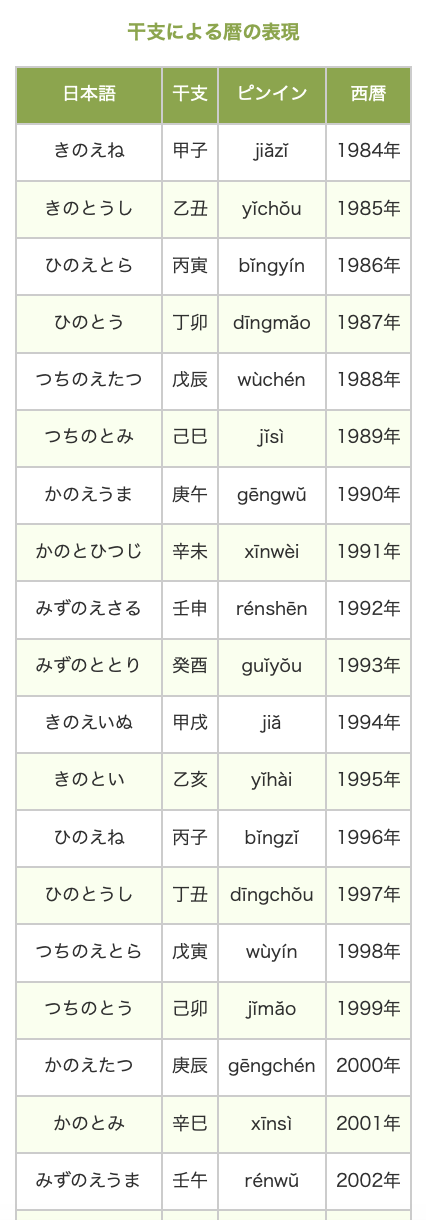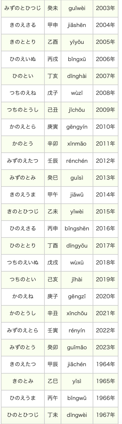 干支は全部で60種類あるため、干支による暦の表現は、「60年周期」となります。西暦の欄の年に60の倍数を足したり引いたりした年も同じ干支になります。