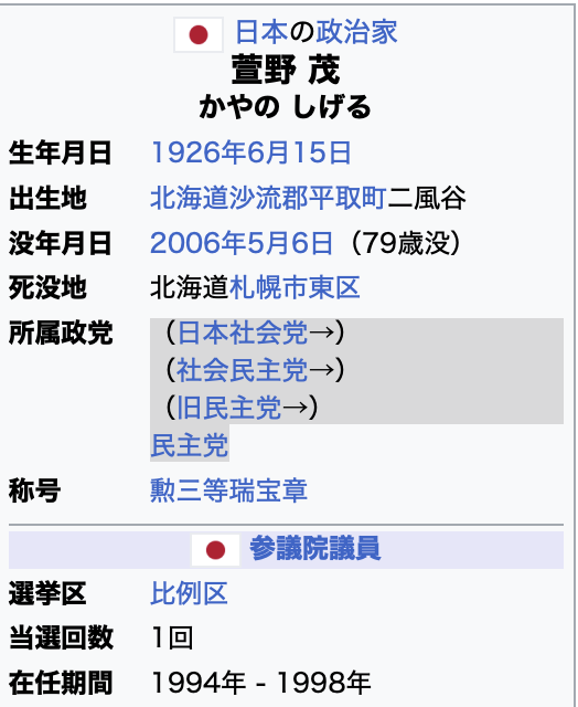 「父の人脈」もすごいですが、私は現役だったので、(日本社会党→)(社会民主党→)(旧民主党→)民主党と移動させて、アイヌの萱野 茂(かやの しげる)1926年6月15日2006年5月6日)を国会議員にしてあげたので、「アイヌ新法」を国会で作らせて「アイヌに補助金」が出るようにしたのも私です。