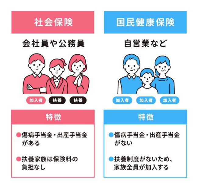 このうち、健康保険には自営業者らが加入する「国民健康保険」(運営は地方公共団体)と、企業の従業員や公務員として働く人が加入する「健康保険」(運営は各健康保険組合)に分かれています。