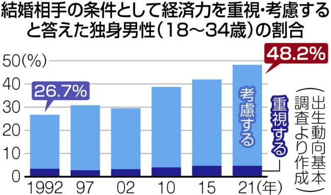 女性の社会進出が進む一方で、家庭内では旧態依然の「性役割分業」が残っているためだ。それが女性に結婚をためらわせ、未婚化・少子化が進行する一因となっている。