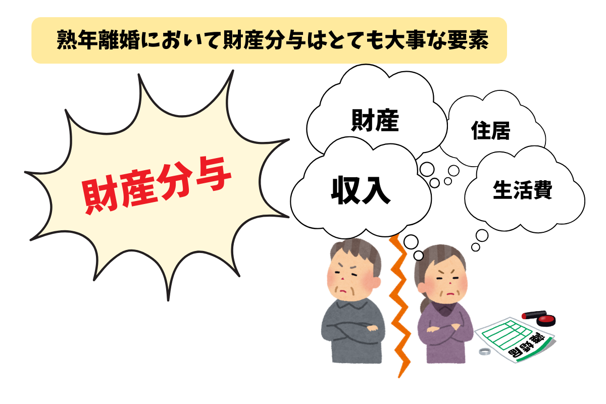 財産や収入は、熟年離婚になるとよりシビアな問題になります。そして、財産や収入の確認の中でも財産分与はとても大事な要素です。