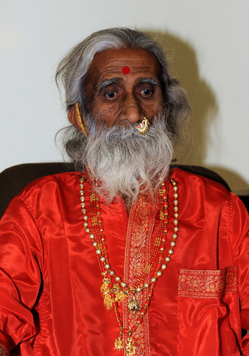 インド・アーメダバード(Ahmedabad)の病院で、国防省研究機関の医師団による観察を終えて会見する自称「70年間断食」のプララド・ジャニ(Prahlad Jani)さん(2010年5月6日撮影)