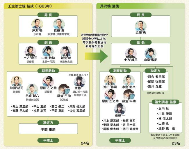 ※新選組の主なメンバーは、近藤勇、土方歳三、沖田総司、斎藤一、永倉新八、山南敬助、藤堂平助、原田左之助、井上源三郎、伊東甲子太郎など。