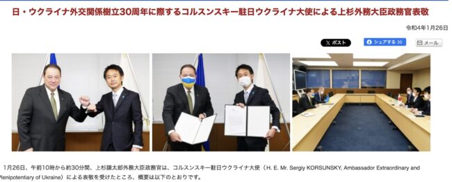外務省) 1月26日、午前10時から約30分間、上杉謙太郎外務大臣政務官は、コルスンスキー駐日ウクライナ大使(H. E. Mr. Sergiy KORSUNSKY, Ambassador Extraordinary and Plenipotentiary of Ukraine)による表敬を受けたところ、概要は以下のとおりです。