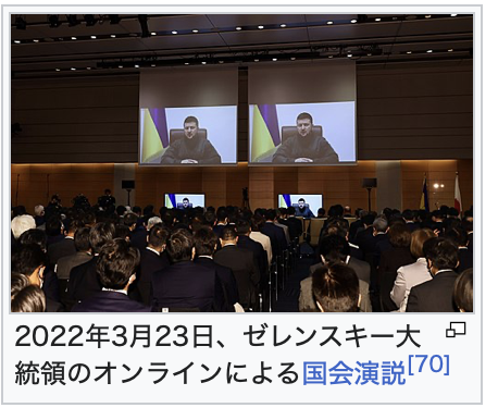 2022年3月23日、ゼレンスキー大統領は衆議院議員会館にある国際会議室と多目的ホールでオンライン演説を行った。海外の要人の国会演説では初めてオンライン形式によるものだった。ウクライナ語で話す演説の内容は、在日ウクライナ大使館の同時通訳で伝えられた[71][72][73]