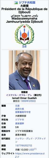 ジブチ共和国の先代大統領の「ハッサン・グレド・アプティドン」と、現大統領の イスマイル・オマル・ゲレの娘にも「私の子供」がいるので義兄弟同士でお互いの家族を守り合うのは当然なので、「日本の必要物資」は安全に運ばれていると思って下さい。