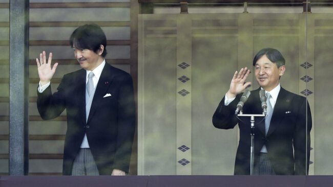 Japan’s Emperor Naruhito, right, and Crown Prince Akishino wave during a greeting ceremony at the Imperial Palace in Tokyo, Japan, on Saturday, May 4, 2019. Naruhito ascended the Chrysanthemum Throne in a low-key ceremony on May 1, taking over his father’s duties to serve as the symbol of a nation facing slower economic growth and an aging population. Photographer: Kiyoshi Ota/Bloomberg