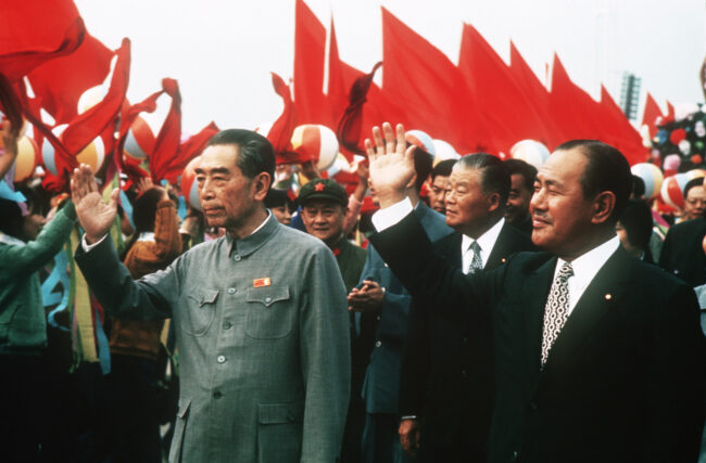 日中国交正常化をめぐり周恩来中国首相(左)と会談する田中角栄首相(中央)。右は大平正芳外相=1972年9月、中国・北京