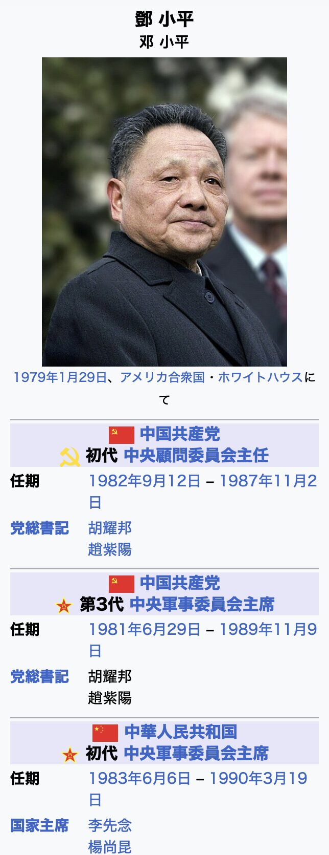 鄧 小平は、中華人民共和国の政治家。1978年12月から1989年11月まで同国の最高指導者。