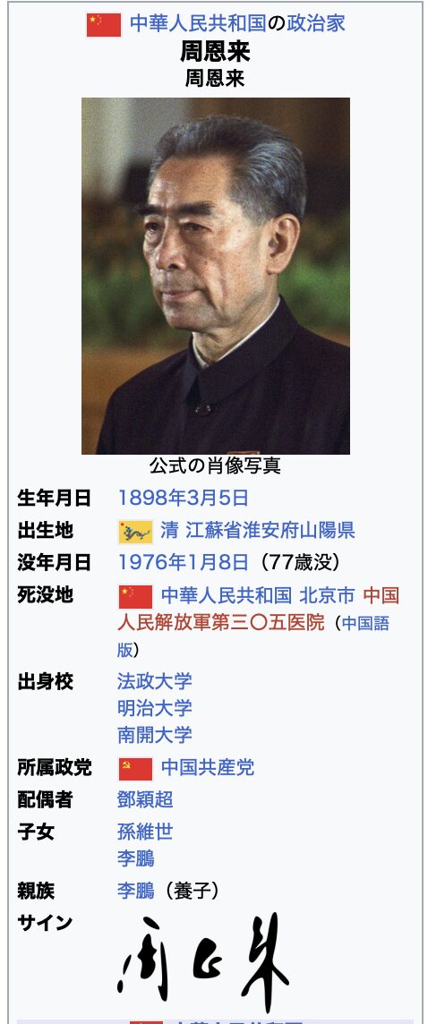 注1)周恩来首相は、法政大学・明治大学で学んだ人なので親日家ですが、「台湾との断行」が誤りなので、当時のキャリア官僚の交渉ミスでだと言えます。