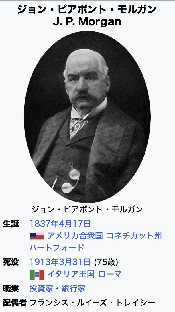 日本人のマーゴが3歳の時に「人身売買」で父親に売られた「マーゴ」を買いとって、頭がおかしい息子のオモチャにした父親は、ジョン・ピアポント・モルガンは、1837年4月17日 – 1913年3月31日)なので、77歳の第一次大戦の時に「アメリカ人を映画で支配」することにしたそうです。