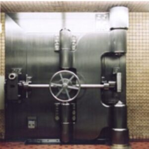 この扉(とびら)は、後から地下金庫をひろげた昭和7年に取付けたものです。 米国製で、厚さは90センチ、重さは25トン(扉15トン、外わく10トン)あります。