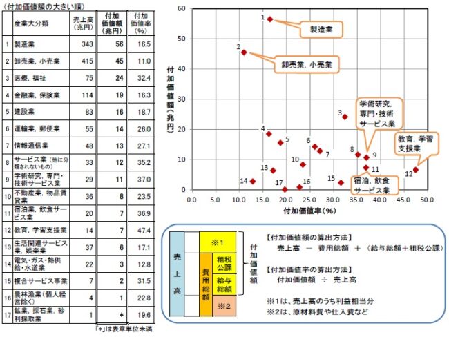 経済産業省のデータによると、日本の産業別売上高では卸売・小売業」が最大で、次いで「製造業」が大きく、両産業で産業全体の売上高の半分以上を占め、日本経済へのインパクトが非常に大きいことがわかります。