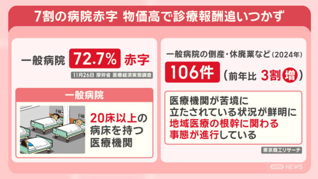 • 厚生労働省の調査(2024年度): 一般病院の6割以上が赤字、平均利益率はマイナス7.3%(2023年度はマイナス7.5%)。