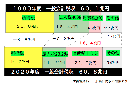 「消費税」が導入された理由は、バブル崩壊の影響で「法人税の収入が減った」からです。