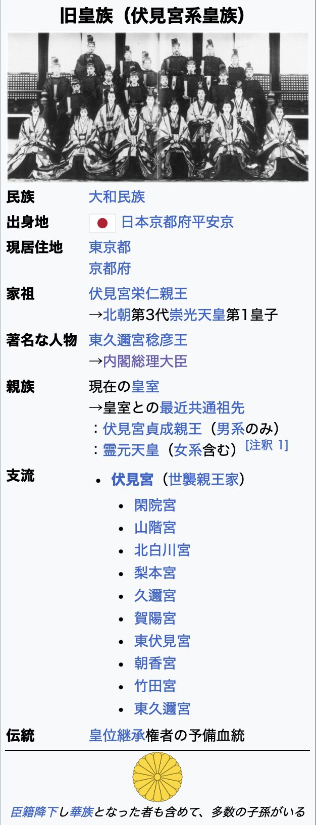 - 伏見宮(ふしみのみや):最も歴史が古く、全ての旧宮家の基礎となる家系