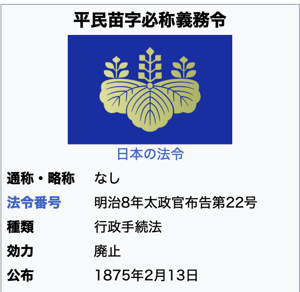 詳細と歴史背景 義務化の背景: 1870年(明治3年)の「平民苗字許可令」で名字が許可されていましたが、税金への警戒感などから普及しなかったため、政府は1875年2月13日に強制力を持つ”布告”を出しました。