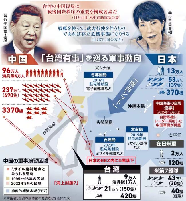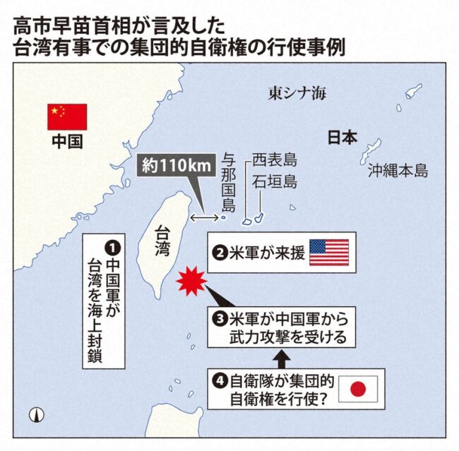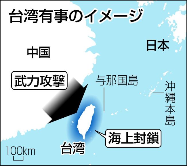 - 台湾海峡で武力衝突が発生した場合、日本は「存続危機事態」と認定し、米軍と連携して自衛隊が動く可能性が高くなっている。