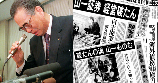 1997年11月24日、日本の四大証券の一角であった「山一證券」は、約3兆円の負債と2,600億円を超える巨額の隠れ借金(簿外債務)が発覚し、自主廃業を決めました。野澤正平社長の涙の記者会見は有名で、「飛ばし」と呼ばれる損失隠しが原因でした。