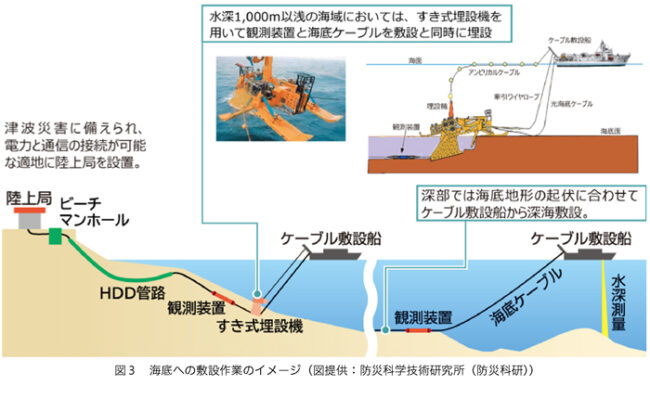 日本中の海の底、特に地震や津波の発生リスクが高いエリアには、地震の揺れ(震度)や津波(水圧)をリアルタイムに測定する「海底地震津波観測網」が設置されています。