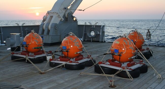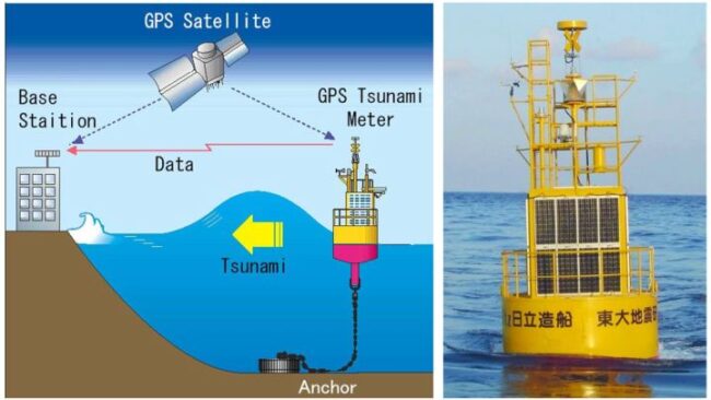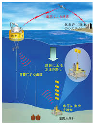 - ブイ式海底津波計: 日本海溝など、震源域の沖合(水深が深い場所)に設置。海面に浮かぶブイと海底の水圧計をケーブルで繋ぎ、海底の津波を検知してブイから衛星通信でデータを送るシステムです。