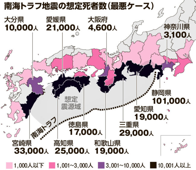 - 都道府県別の状況: 依然として静岡県(約11万人)や和歌山県(約7万人)、高知県(約5万人)などで甚大な被害が想定されています。