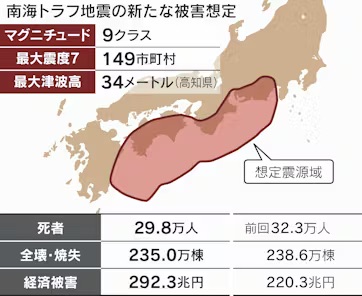 「南海トラフ巨大地震による死亡予測(被害想定)」は、2025年3月に政府(内閣府)によっておよそ13年ぶりに見直され、最新の想定では最悪のケースで最大約29万8,000人とされています。