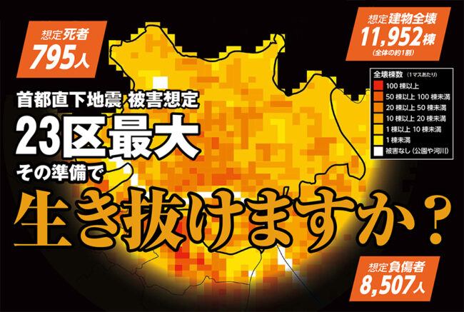 東京都防災会議が2022年に公表した想定では、都内の死者数を最大約6100人(10年前の約9600人から減少)と算出しています。これは都独自の耐震化対策などが反映された数値です。