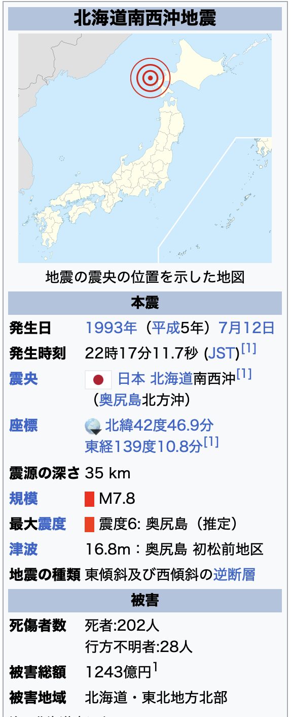 1993年(平成5年)7月12日に起きた北海道の奥尻島地震(北海道南西沖地震)では、202名の島民が亡くなりましたが、宮澤喜一首相は「たかが200名あまり」と言い、小さい報道だけ終わリました。